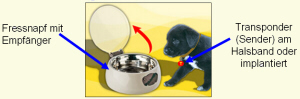 | Durch einen Transponder, der am Halsband des Haustieres hängt oder dem Tier implantiert wurde, "erkennt" der Fressnapf, wer fressen darf und wer nicht. Mit einem Businessplan und einer Jugend-forscht-Arbeit zur Entwicklung und Vermarktung eines "Persönlichen Fressnapfes für Hunde und Katzen" beteiligte sich das Team gleich an zwei Wettbewerben. |