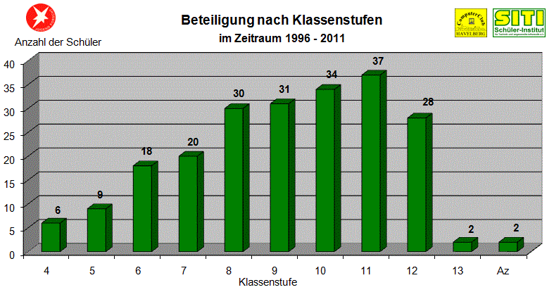 | Interessant ist auch die Betrachtung der Altersverteilung der Jufo-Teilnehmer. Deutlich ersichtlich ist der stetige Zuwachs in den unteren Klassen. In den Klassenstufen 8 -11 ist die Teilnehmerzahl am Höchsten und auch stabil, während es dann zum Abitur hin wieder abnimmt (Az = Azubis). Damit wird auch die Bedeutung der Interessensorientierung in Bezug auf die Berufswahl und Studienvorbereitung deutlich. |