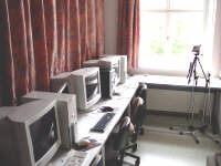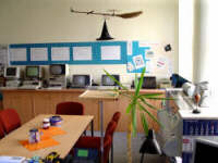 | Raum 0.6 Multimedia Dieser Raum ist mit 10 Computerarbeitsplätzen ausgestattet, die schon etwas älter sind. Dennoch bietet er zahlreiche Möglichkeiten für Soft- wareanwendungen. Der Name "Trickfimstudio" symbolisiert, dass hier mit einfachen Mitteln Trickanimationen erstellt werden können. Das Kurs- angebot wendet sich vorrangig an Schüler der 5. und 6. Klasse, die auf diese Weise den Einstieg in die Grafikbearbeitung finden. Außerdem wird hier an Jugend-forscht-Arbeiten und an Internetseiten gearbeitet. Außerdem kann der Raum als Sprachlabor verwendet werden. |