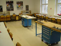 Raum 1.2 UMT-Werkstatt UMT ist ein Unterrichtsmittel für den Technik- und Werkunterricht. Es stehen zahlreiche Halbzeuge (vorrangig aus Plastik) zur Verfügung. Mit speziellen Arbeitsvorrichtungen können diese Halbzeuge leicht bearbeitet werden (schneiden, fräsen, bohren, biegen ...) Auf diese Weise können Schüler ihre eigenen Bauteile für einen Stabil- baukasten fertigen und kombinieren. Somit dient dieser Raum für Angebote an Schulklassen und Gruppen für Projekttage sowie der Lehrerfortbildung. |