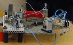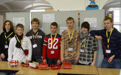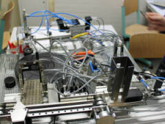 | Das Team mit dem einzigen Mädchen im Technik-Studiengang bewältigte die Aufgabe, ein Formel1-Rennwagen nach dem Reglement der diesjährigen Saison des internationalen Schüler-Wettbewerbs "Formel1 in der Schule" zu konstrieren, zu fertigen und zu präsentieren, erfolgreich. Auch wenn die Farbe bei der Präsentation noch nicht trocken war, konnten sehr gute Rennzeiten auf der Rennstrecke erzielt werden. | Zwei Teams von Konstruktionsanfängern stellten sich der Aufgabe einen Baukasten für eine Eisenbahn mit 5 Anhängern aus UMT-Halbzeugen erst am PC in Solid Edge zu entwickeln und zu konstruieren und dann anhand der eigenen Bauplände die Eisenbahnteile auch selbst in der Werkstatt herzustellen. Die Abstimmung im Team zu Radständen und Kupplungen klappte gut, wie man am Ergebnis sieht. | Bei den Automatisierern funktionierte die Teamarbeit auch bestens. Vier Schüler planten den Umbau der FESTO-Transpotanlage. Kernstück der neuen Anlage wurde ein Drehteller als Übergabeportal. Die anderen drei Schüler entwickelten mit den neu erworbenen Programmierkenntnissen ein SPS-Programm. Trotz fehlender Teile konnte das Funktionsprinzip der Anlage zum Schluss doch noch demonstriert werden. |