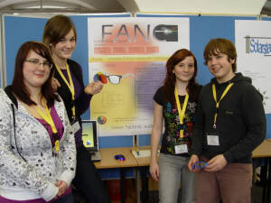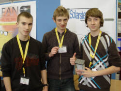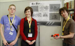 | Mit einer Brille, deren Farbe sich dem Outfit anpasst, hätten die "Firmengründer" von "Crystal" sicher gute Marktchancen. Eine nahezu perfekte Präsentation auf der Schülerfirmen- und Technikmesse lieferten die vier Teammitglieder ab, reagierten professionell auf Nachfragen der Jury und demonstrierten ein mögliches Funktionsprinzip. Wenngleich in einer Woche Projektarbeit noch keine wirkliche Lösung vorliegen konnte, zeigten sich die Schüler von einer zukünftigen Realisierbarkeit überzeugt. |