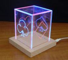 Auch bei der Schülerfirma "Acrylight" sind Firmenname und Produktidee identisch. Der interessante Name verbindet Material und Funktion geschickt miteinander. Ein mit LEDs beleuchteter Quader aus Acrylscheiben ist nicht nur ein schöner Blickfang im Raum. Das Konzept von Christin, Florian, Maximilian, Julien und Stophie sieht auch die Nutzung des Innenenraums als Dose vor. Der Protoyp stellt die Farben eines Kartenspiels dar und könnte somit zugleich als Aufbewahrung eines solchen dienen. |