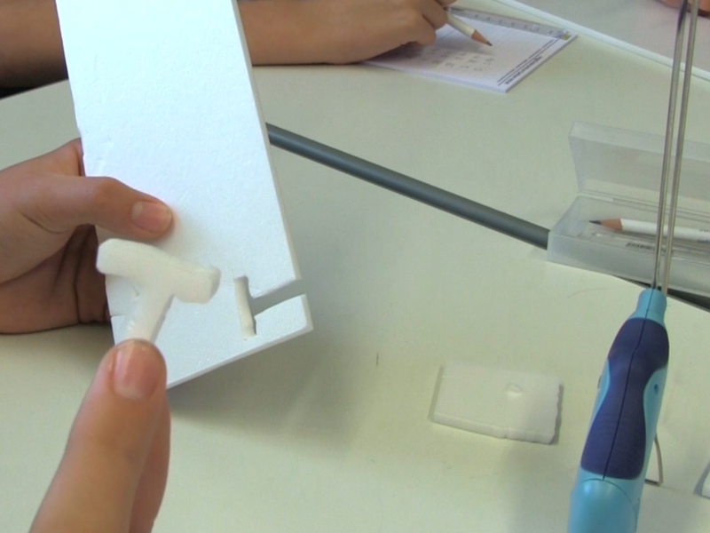 Es ist das Wort TECHNIK mit Hilfe eines „Heißen Drahtes“ einmal mit einem Handwerkzeug und einmal mit einer CNC-Maschine (FiloCUT) aus SETRON auszuschneiden. Beide Arbeiten sind vorher durch Konstruktion der Buchstaben auf kariertem Papier zu planen.