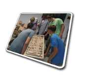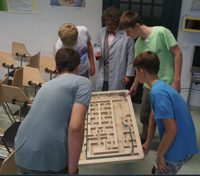Hier geht es um ein übergroßes Labyrinth, auf dem die verschiedenen Bildungswege vom Kindergarten bis zur abgeschlossenen Ausbildung mit einer Kugel durchlaufen werden können. Vier Team-Mitglieder an vier Ecken rollen die Kugel durch den vorgegeben Bildungsweg möglichst ohne Umwege, denn das gibt Minuspunkte.