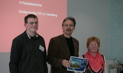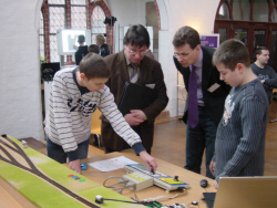 Für beide eine interessante Erfahrung, die Teilnahme am Landeswettbewerb. In der Freizeit wurde auch viel geboten: Spannend war der Besuch der Vorbereitungen zum Deutschen RoboCup-Wettbewerb am Nachmittag und ein Bowling-Tournier am Abend. Bei der Preisverleihung gab es für beide Teams Sonderpreise und das Schüler-Institut erhielt als aktive Schule den Sonderpreis der TOTAL und konnte sich 15 neue Flachbildschirme bestellen. Die Betreuer Johann, Dr. König und Frau Fischer nahmen den Gutschein gemeinsam entgegen. |